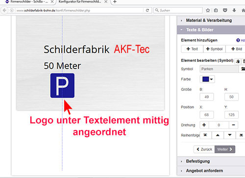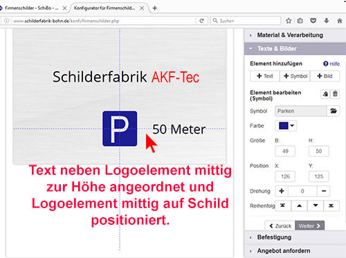 Test mit Mauszeiger (Cursor) mittig auf dem Schild positionieren.