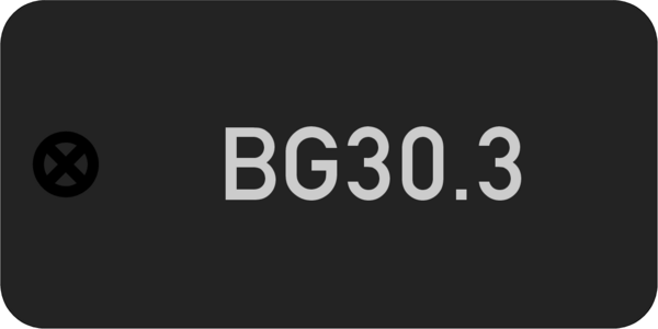 Schild 30x15x1,0 mm, Alu scharz matt, Ecken R2, 1 Bohrung links 2,5mm, Rand-Lochmitte 3,0mm, Text silber herausgraviert,